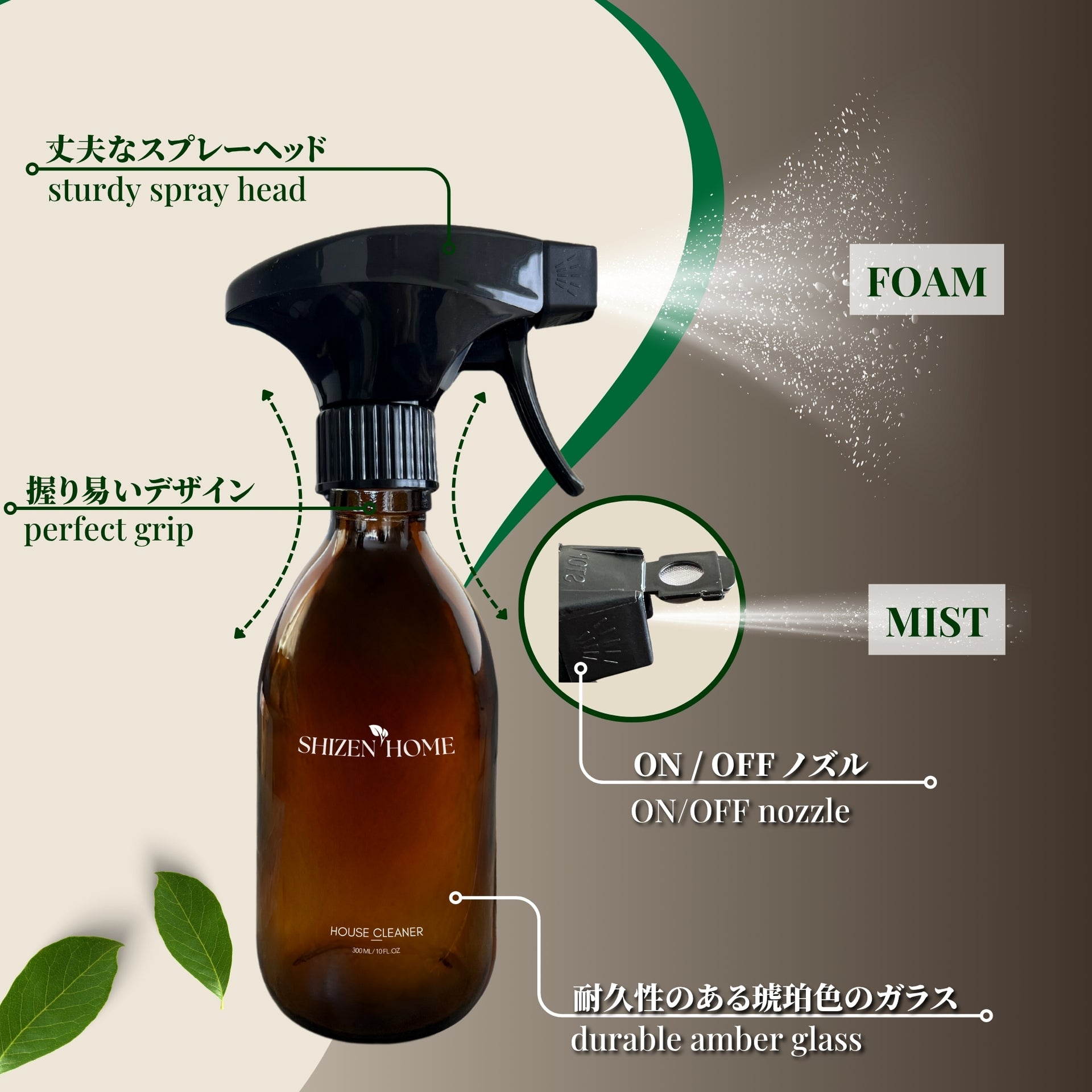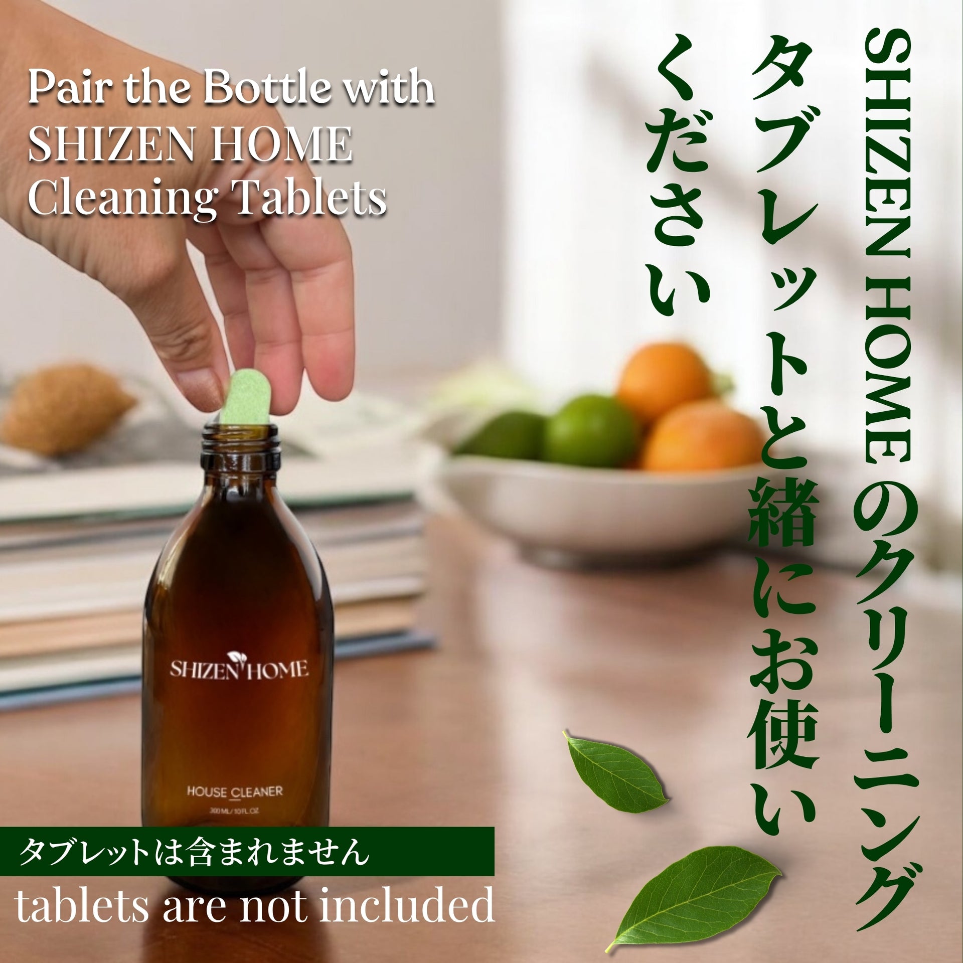 When using with SHIZEN HOME cleaning tablets, put one tablet into the bottle and fill with warm water up to the bottle’s shoulder. Let the tablet dissolve completely. After that, close the spray cap tightly. Turn the nozzle “ON” when using, and “OFF” when not in use. If using cleaning tablets, do not close the cap until the tablet is fully dissolved. Do not use with thick or sticky liquids.
