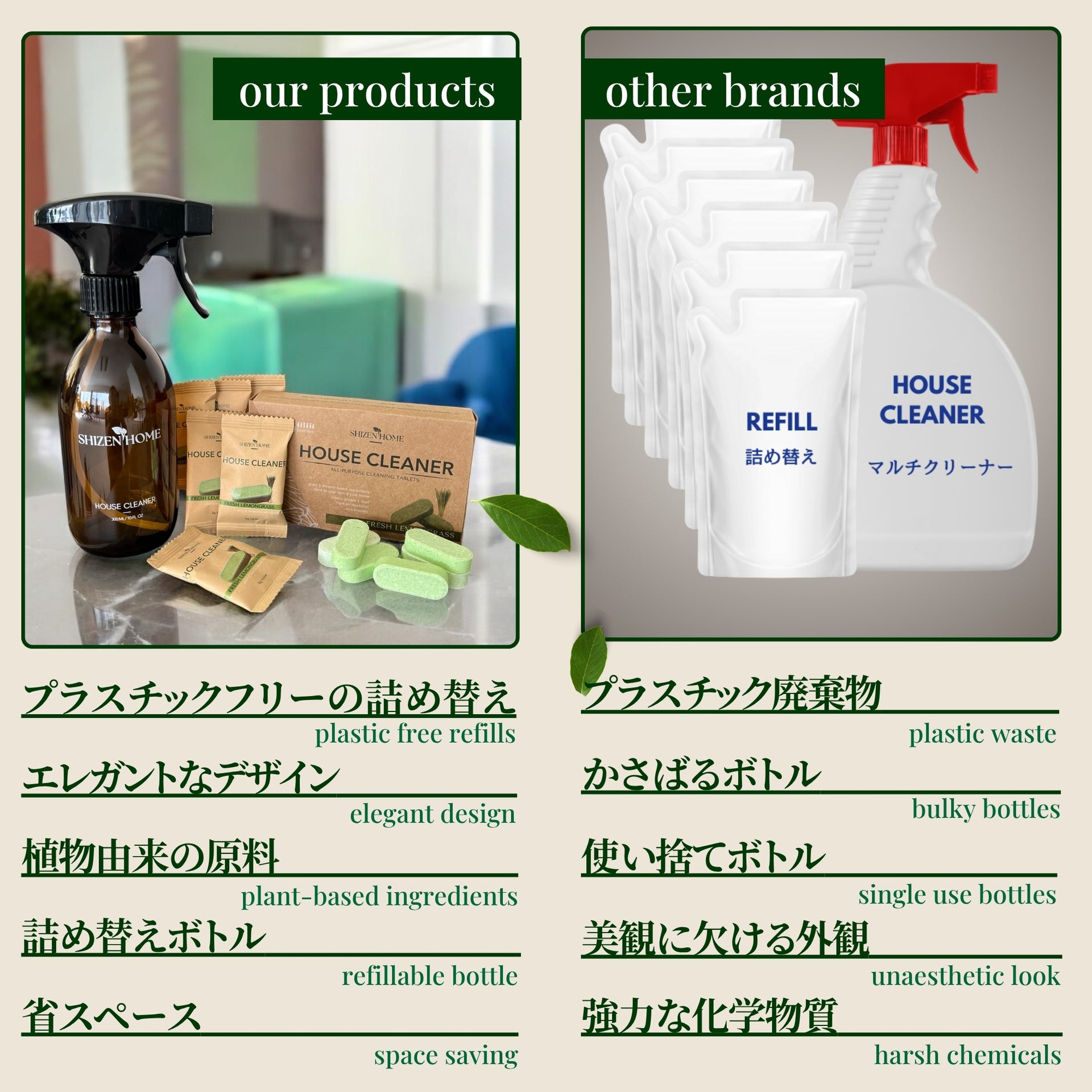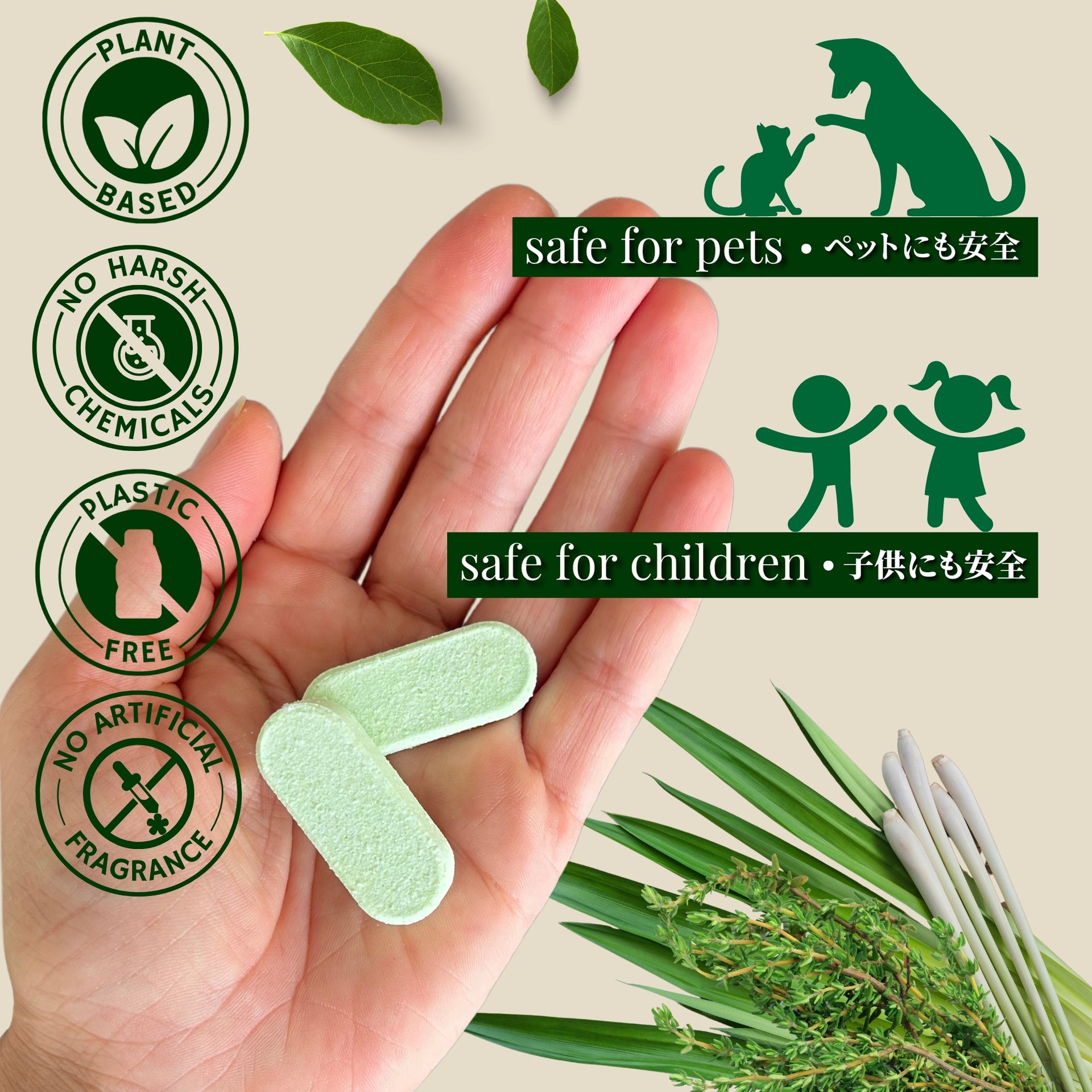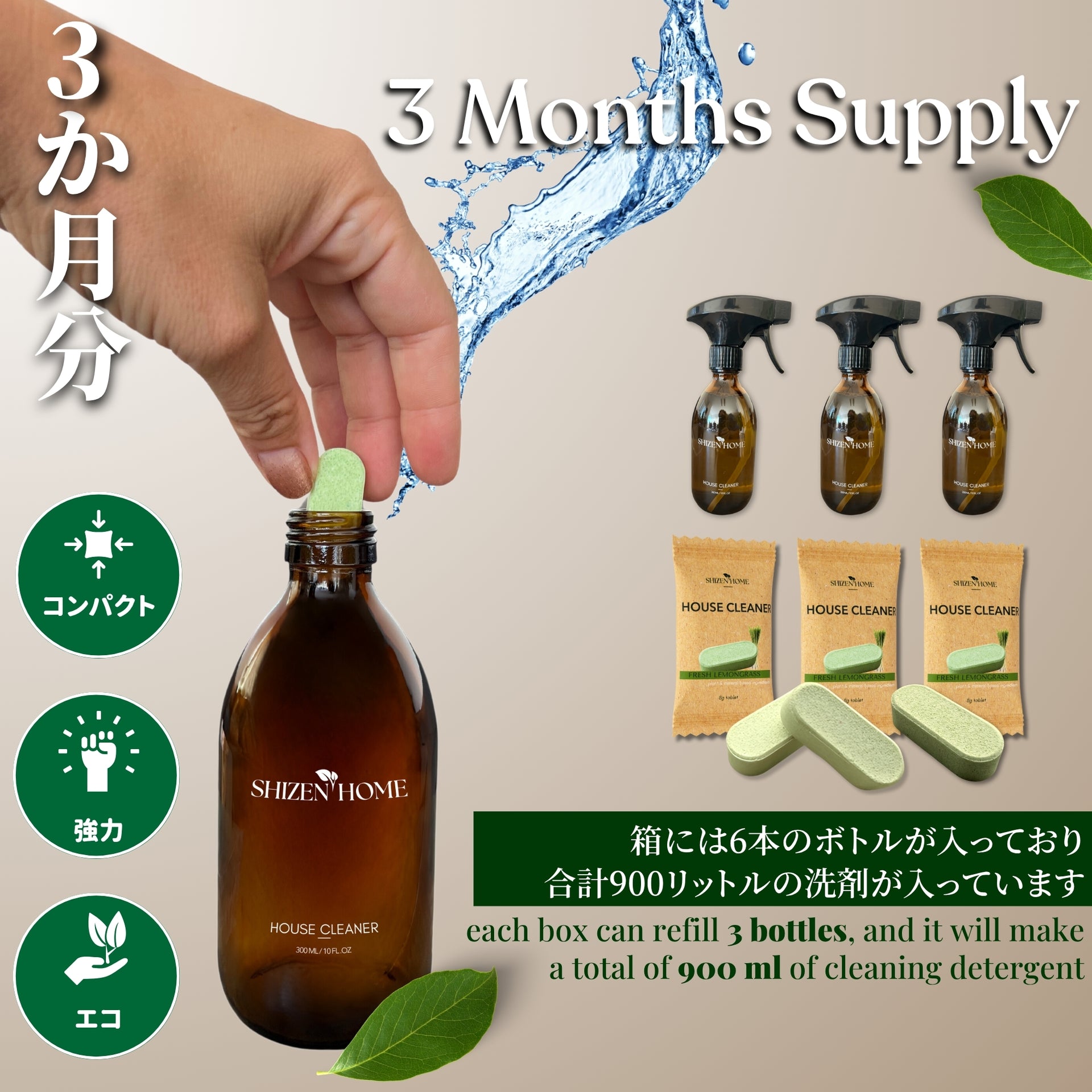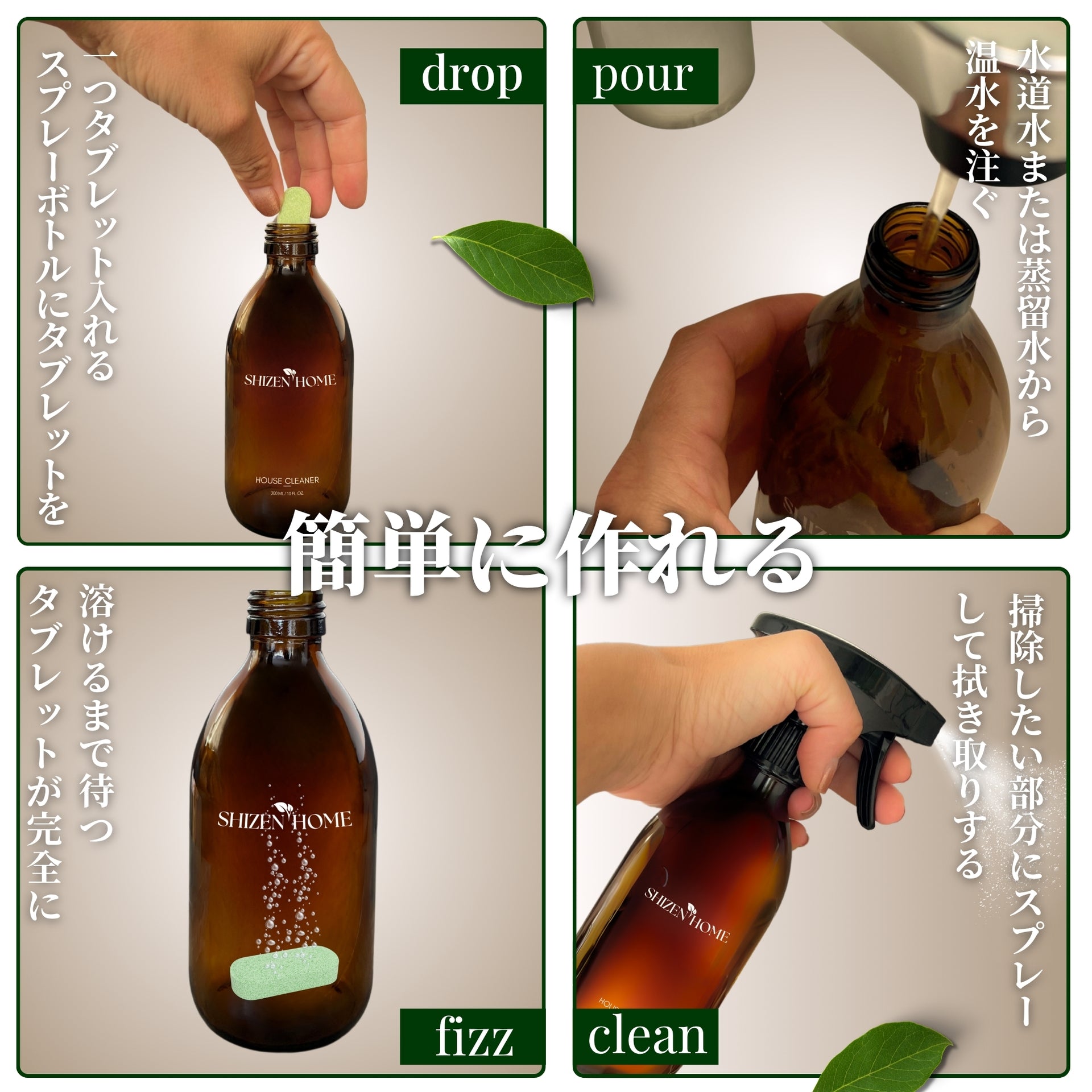 作り方:エコボトル、またはお手持ちのスプレーボトルにタブレットを1錠入れます。ぬるま湯をボトルの半分まで注ぎ、完全に溶けるまで10〜15分ほど置いてください。溶けたら残りの水を入れれば準備完了です。より濃い配合にする場合は300mlの水を、軽めに仕上げたい場合は500mlの水を使用してください。