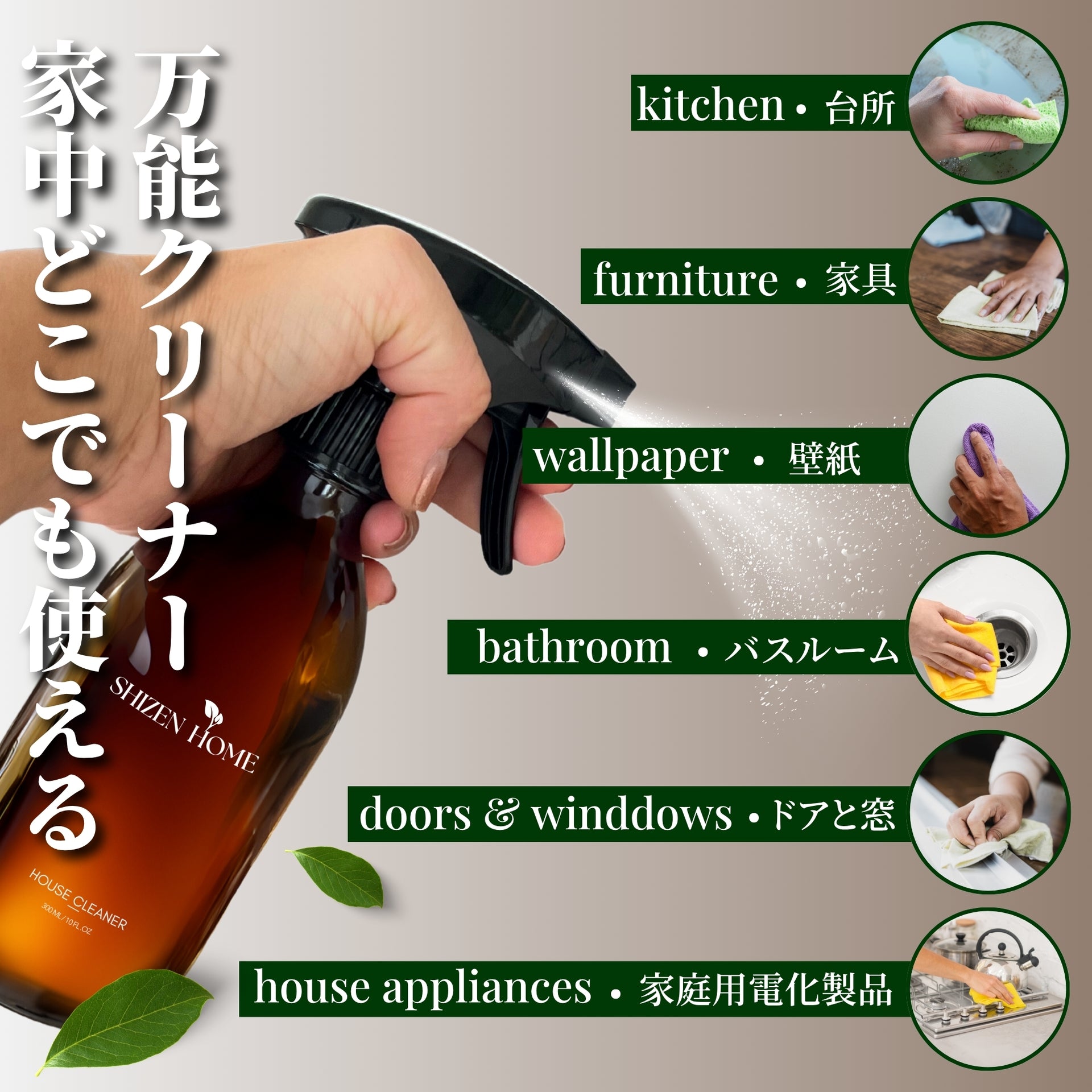 使用方法:表面に直接スプレーし、乾いた布で拭き取ってください。すべての成分は無害で日常使用に安全なため、水で洗い流したり手袋を着用したりする必要はありません。